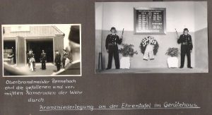 Kranzniederlegung an der Ehrentafel im Gerätehaus während der Fahnenweihe der Feuerwehr am 23. Mai 1954